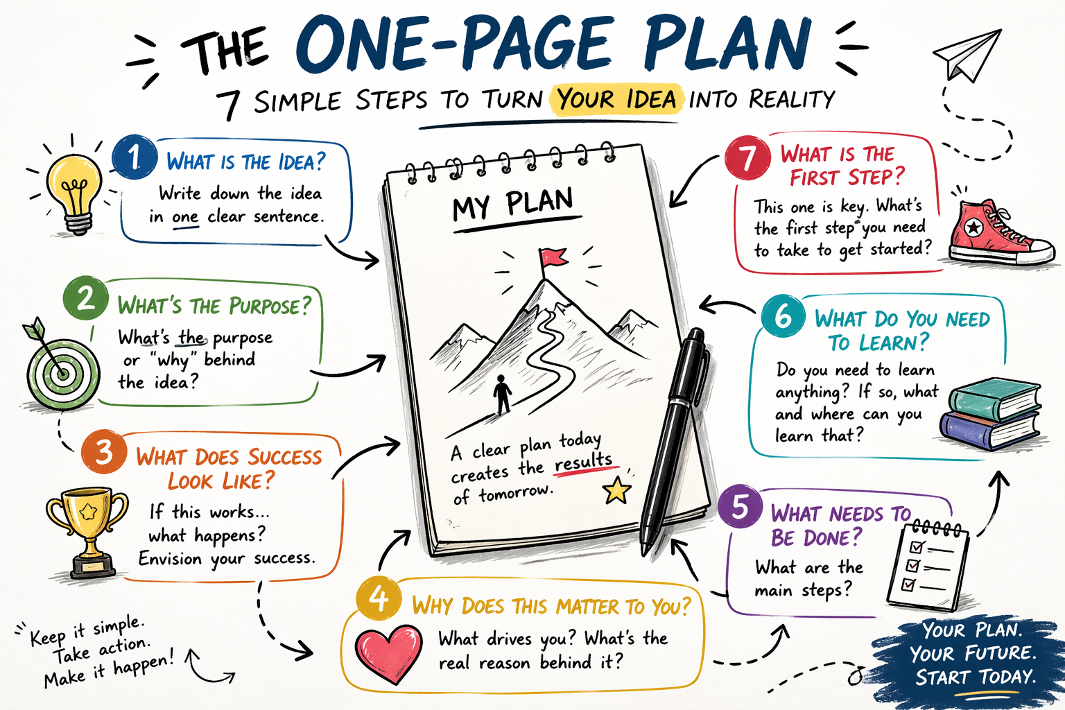 If you’re wondering how to actually do this, it’s simpler than you think. A one-page plan is built by answering a few key questions, and each one plays an important role in turning your idea into something real.